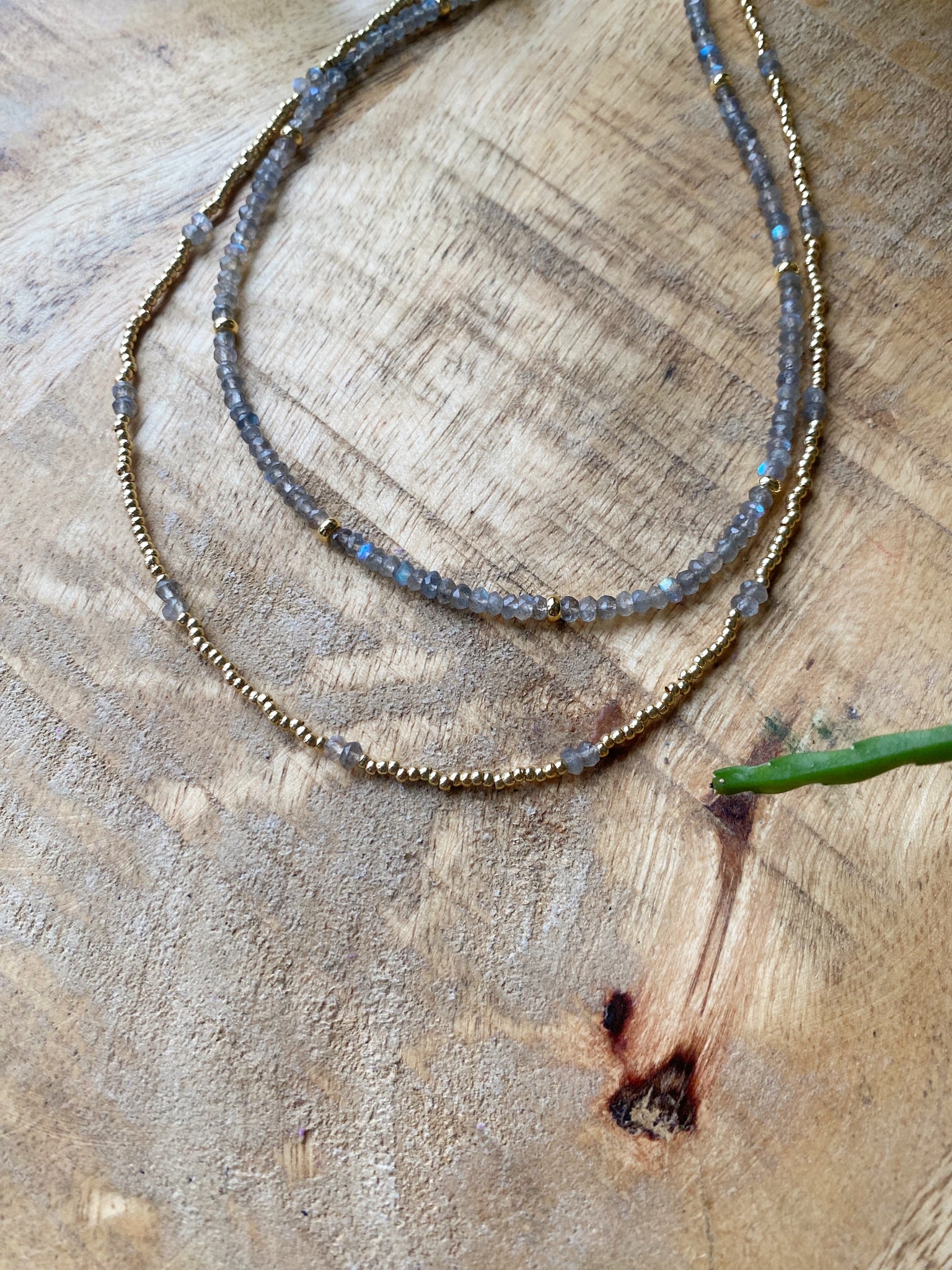 > die längere Kette ist aus Gold filled und Labradorit