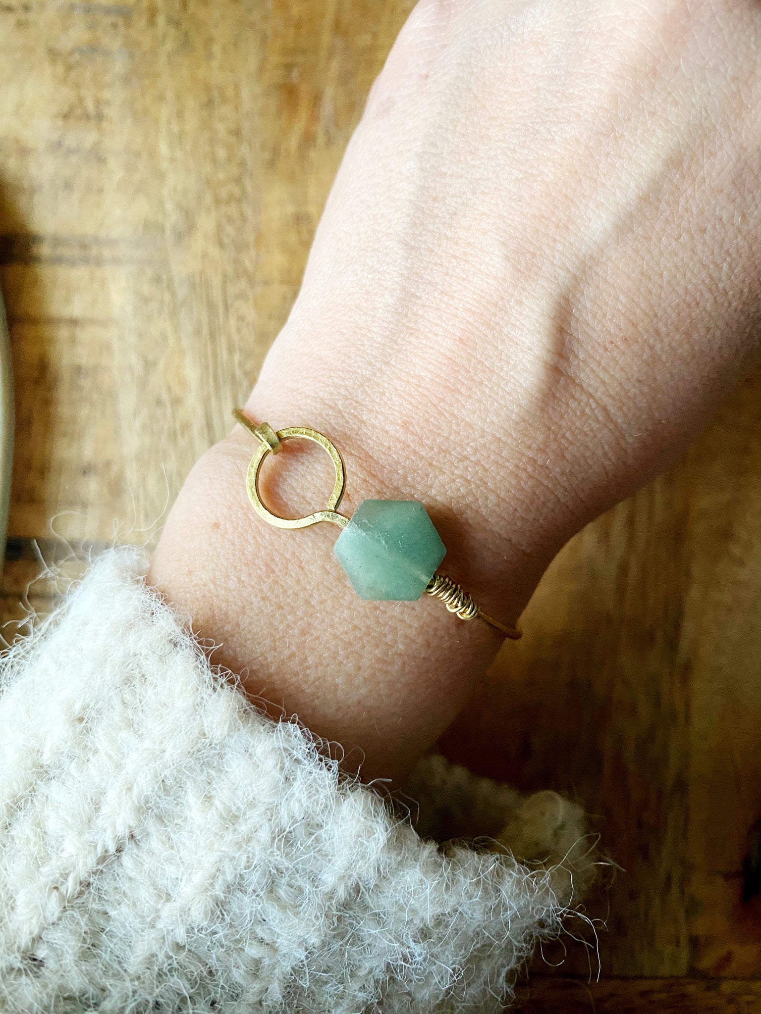 >Handgemachte Manschette aus Juwelier Messing mit Aventurin Hexagon